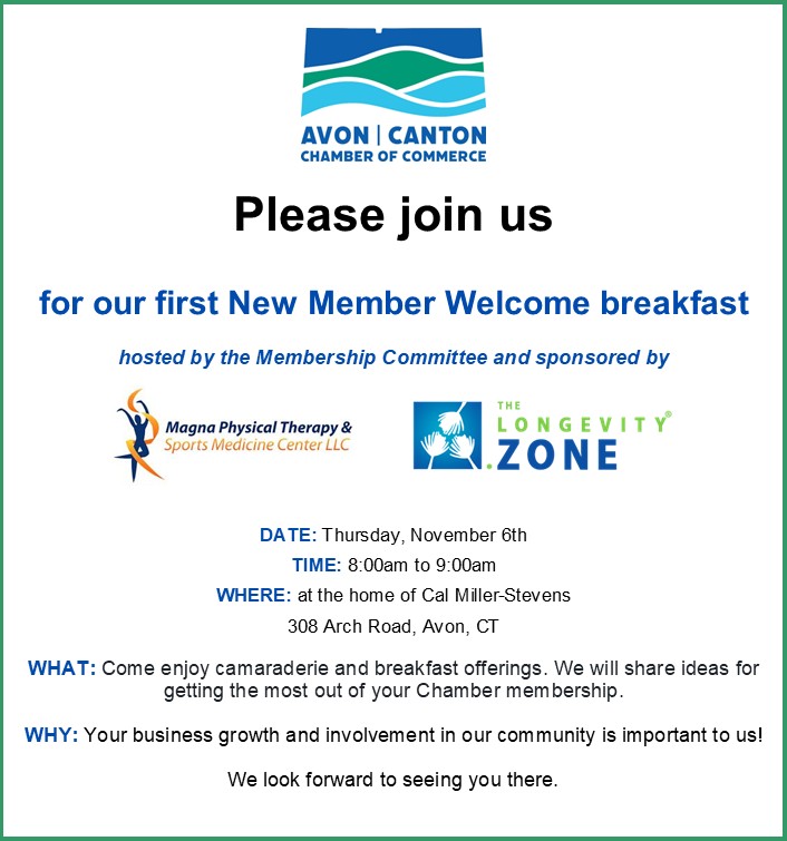 Avon/Canton Chamber of Commerce For more information contact Avon Canton Chamber of Commerce at 860.675.4832 ext. 1. |