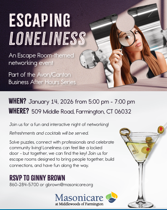 Business After Hours/Happy New Year hosted by: Masonicare at Middlewoods of Farmington Masonicare at Middlewoods of Farmington has done it yet again!! This year's Business After Hours is an ESCAPE ROOM-THEMED event. These Escape Rooms are designed to bring people together, build connections, and allow you to have a lot of fun while participating. Refreshments and Cocktails will be served. We are kicking off a brand new year of networking at Masonicare at Middlewoods of Farmington -- a small, home-like assisted and independent living community. Owned and managed by Masonicare, Middlewoods is specially designed to promote a relationship-centered approach to caring. They offer 70 studio, one- and two-bedroom apartments; three meals a day all made to order; educational programs and presentations; trips to local stores, restaurants and concerts; along with a full range of activities. Thank You to the following Chamber Members that have Donated An Item for the Drawing at this Business After Hours: